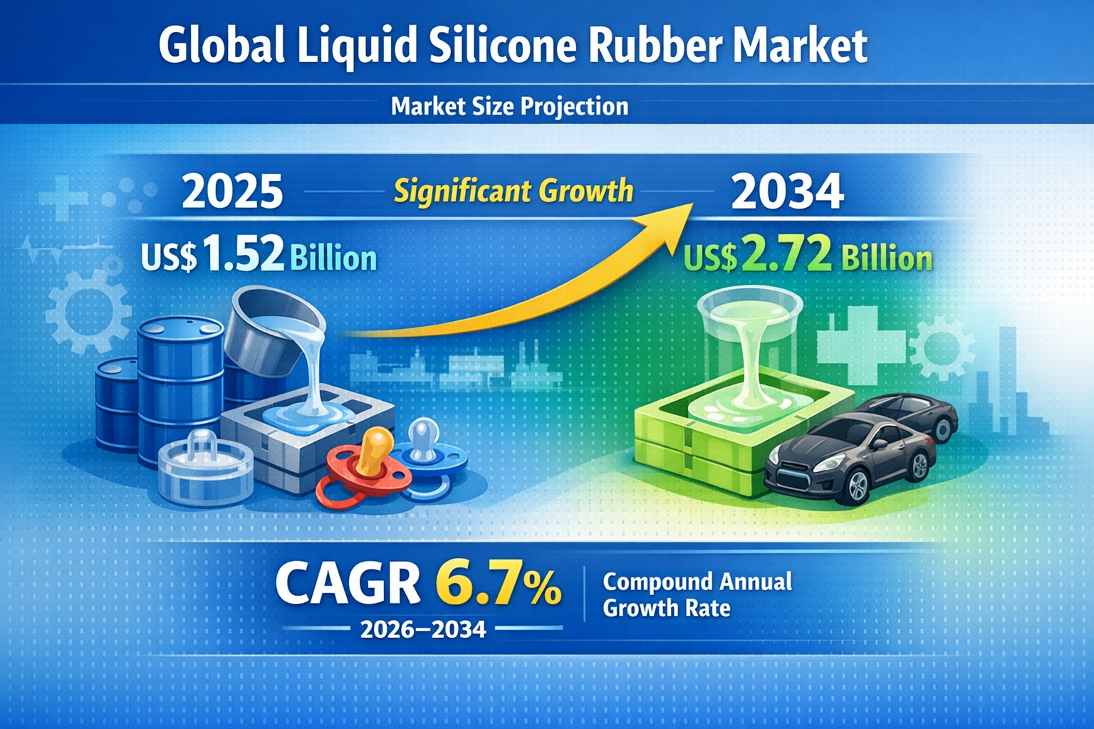 The Liquid Silicone Rubber Industry Size is analyzed within a global market framework valued at US$ 1.52 billion in 2025 and projected to reach US$ 2.72 billion by 2034 at a CAGR of 6.7%, drawing on historical data from 2021 through 2024. The research covers grade segments food, medical, industrial and end users spanning healthcare, automotive, consumer goods, and electricals and electronics, with North America receiving dedicated country-level analysis across the US, Canada, and Mexico.