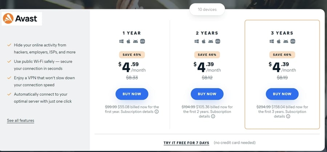 Avast SecureLine VPN takes a notably different approach to pricing. The service limits customers to longer commitment periods only, offering one-year, two-year, or three-year subscriptions exclusively. Unlike most competitors, Avast doesn't provide significant discounts for longer commitments.
