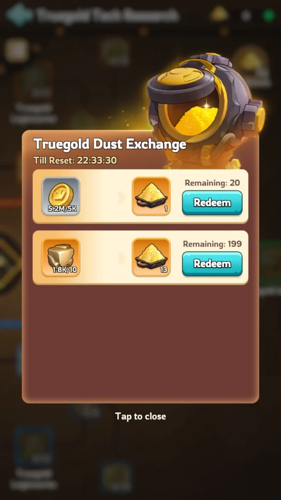 • 10 Truegold can be converted into 13 Truegold Dust, allowing up to 200 redemptions per day, which totals a maximum of 2,600 Truegold Dust daily.