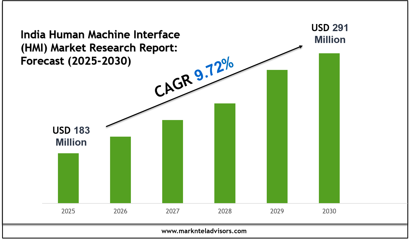 The India Human Machine Interface (HMI) Market size is valued at around USD 183 million in 2025 and is expected to reach USD 291 million by 2030. Along with this, the market is estimated to grow at a CAGR of around 9.72% during the forecast period, i.e., 2025-30.