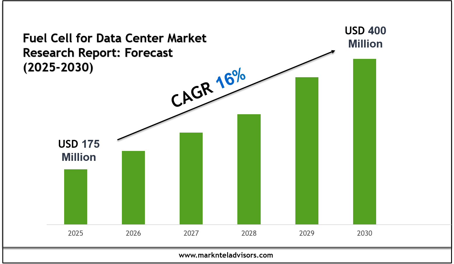 The Global Fuel Cell for Data Center Market size was valued at around USD 175 million in 2024 and is projected to reach USD 400 million by 2030. Along with this, the market is estimated to grow at a CAGR of around 16% during the forecast period, i.e., 2025-30.