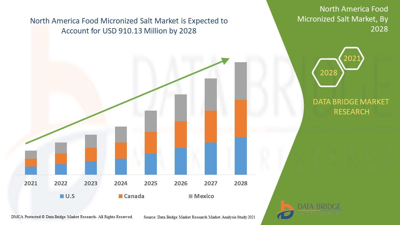 North America food micronized salt market is expected to reach USD 910.13 Million by 2028 from USD 684.08 Million in 2020. Data Bridge Market Research has estimated the market to be growing at a steady CAGR of 3.8% in the forecast period of 2021 to 2028.