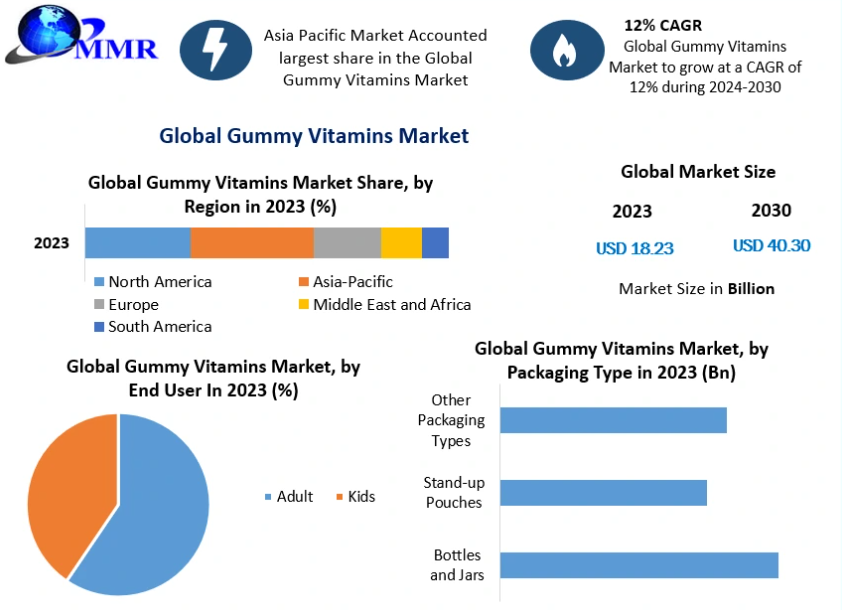 Gummy Vitamins Market was valued at USD 18.23 Bn. in 2023. The Global Gummy Vitamins Market size is estimated to grow at a CAGR of 12% over the forecast period.