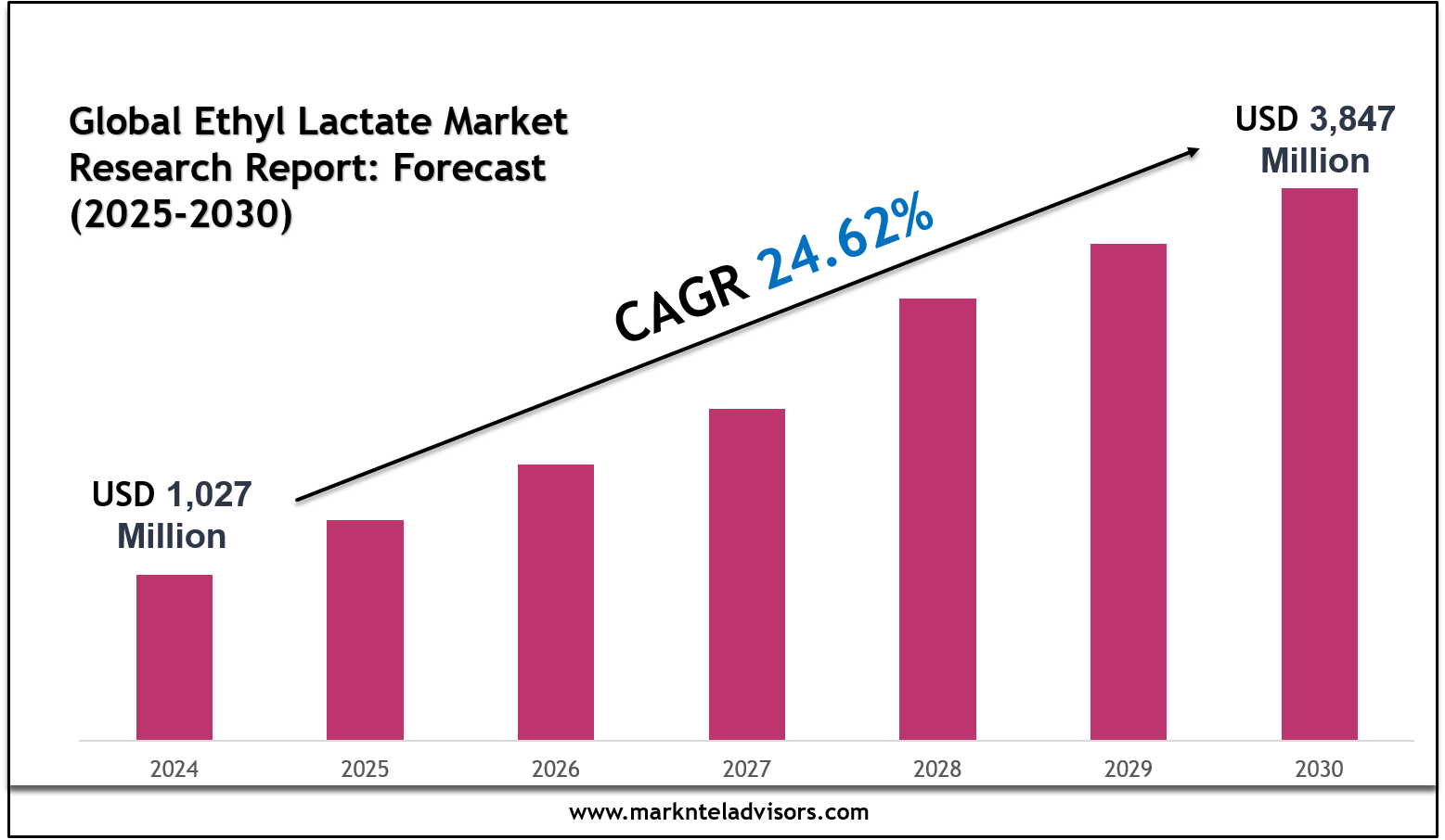 As per MarkNtel Advisors the Global Ethyl Lactate Market size was valued at around USD 1,027 million in 2024 and is expected to reach USD 3,847 million by 2030. Along with this, the market is estimated to grow at a CAGR of around 24.62% during the forecast period, i.e., 2025-30.