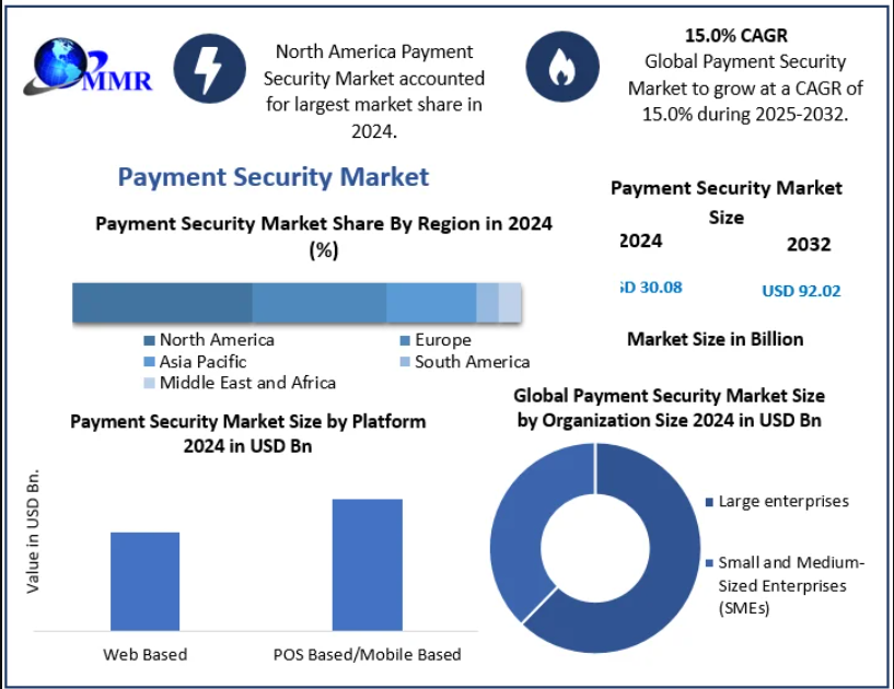 The Global Payment Security Market was valued at USD 30.08 billion in 2024 and is projected to grow at a CAGR of 15.0% from 2025 to 2032, reaching approximately USD 92.02 billion by 2032. This strong growth reflects the surge in digital payment adoption and the increasing need to safeguard financial data against evolving cyber threats.
