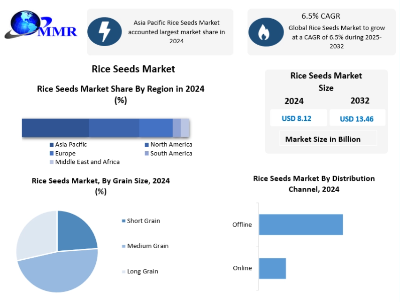 The global Rice Seeds Market, valued at USD 8.12 billion in 2024, is projected to reach USD 13.46 billion by 2032, expanding at a CAGR of 6.5%. Growth is primarily driven by population expansion, increasing dependence on rice as a staple food (especially in Asia-Pacific), adoption of hybrid seed technologies, and rising health consciousness fueling demand for high-quality and organic rice.