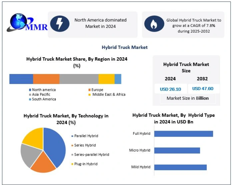 The Hybrid Truck Market was valued at USD 26.10 billion in 2024, and the total global revenue is projected to grow at a CAGR of 7.8% from 2025 to 2032, reaching USD 47.60 billion by 2032. The market is undergoing rapid transformation driven by tightening emission norms, fleet electrification, and advancements in hybrid powertrain technologies.
