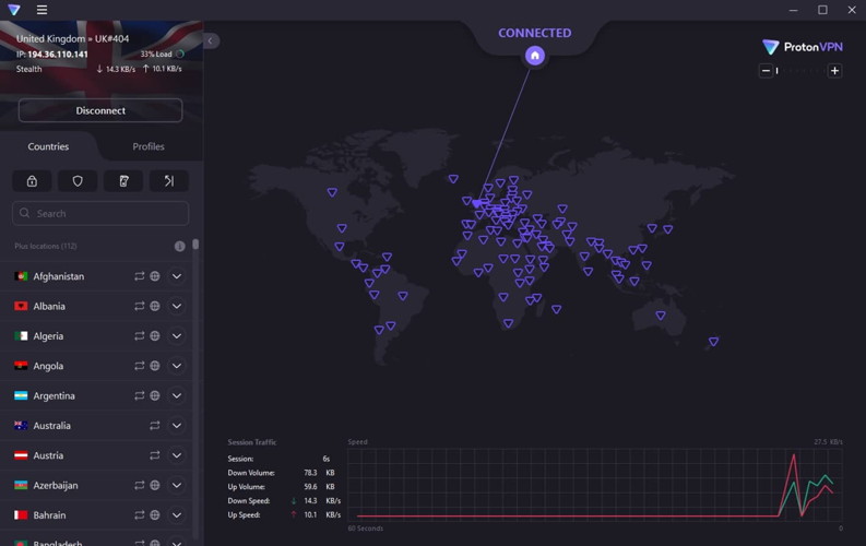 The application features a distinctive interface with two primary perspectives. The initial default screen presents a simple location selection menu alongside a quick connect option, making it suitable for straightforward browsing needs. However, more experienced users may prefer the advanced view, which unlocks comprehensive settings and detailed connection statistics. Most options are conveniently organized on a single page, while specialized features such as the kill switch and stealth mode are accessible through dedicated tabs. Additionally, beginners will find it helpful that live chat support can be accessed directly within the app, streamlining the process and eliminating the hassle of visiting the support website to locate the chat feature.