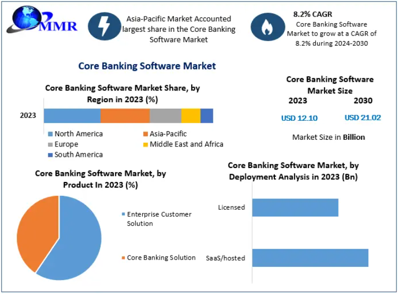 The global Core Banking Software Market, valued at US$ 12.10 billion in 2023, is on track to reach US$ 21.02 billion by 2030, growing at a CAGR of 8.2%. As banks shift toward high-speed digital operations and customer-centric service models, core banking software (CBS) has emerged as the digital backbone of modern financial institutions.