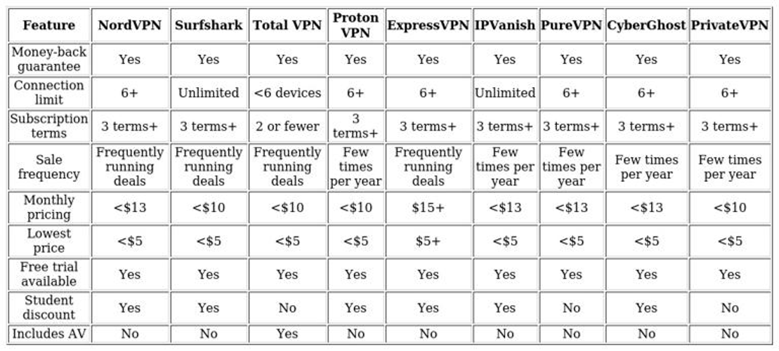 When assessing VPN providers, our approach extends beyond just looking at price. We consider how frequently each service offers discounts or promotions, as well as potential savings through longer-term plans or special student rates. The importance of different metrics in evaluating value is summarized in the comparison table below, highlighting which aspects we prioritize in our overall assessment.