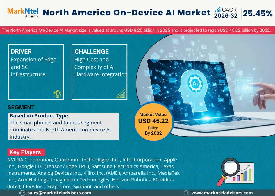 MarkNtel Advisors, a leading market research and consulting firm, has announced the release of its latest study titled North America On-Device AI Market Research Report: Forecast (2026–2032). This report provides a detailed assessment of the North America On-Device AI Market, covering its evolving dynamics, emerging trends, key growth drivers, major challenges, and competitive landscape.
