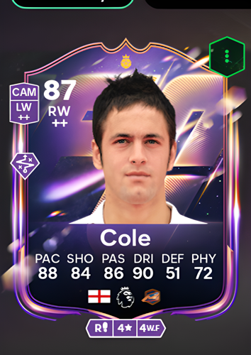 Joe Cole’s Heroes card stands out as an 87-rated Right Wing, boasting an impressive blend of pace (88), dribbling (90), and passing (86) that makes him a formidable presence on the flank. With a shooting rating of 84, he’s more than capable of finishing chances, while his agility and ball control allow him to weave through defenders with ease. As a winger, Cole’s sharp attacking attributes enable him to break down opposition defenses swiftly, creating and converting opportunities that can turn the tide of any match in your favor.