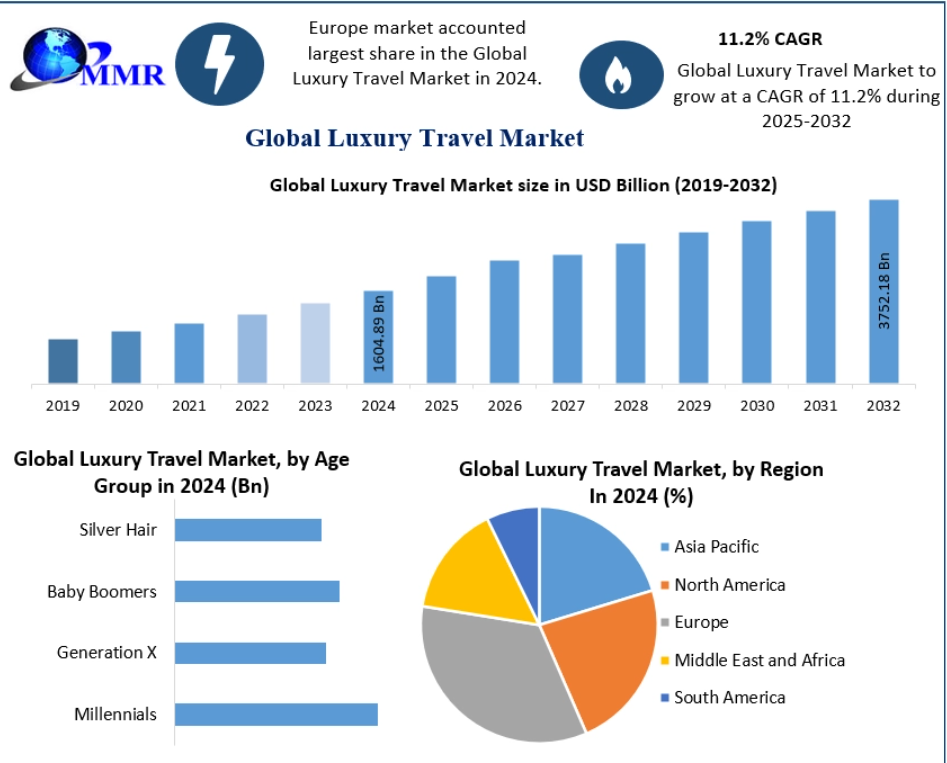 The global Luxury Travel Market was valued at USD 1,604.89 billion in 2024 and is projected to grow at a strong compound annual growth rate (CAGR) of 11.2% from 2025 to 2032, reaching nearly USD 3,752.18 billion by 2032. This impressive expansion reflects the rising appetite for premium, personalized, and experience-driven travel among affluent consumers worldwide.