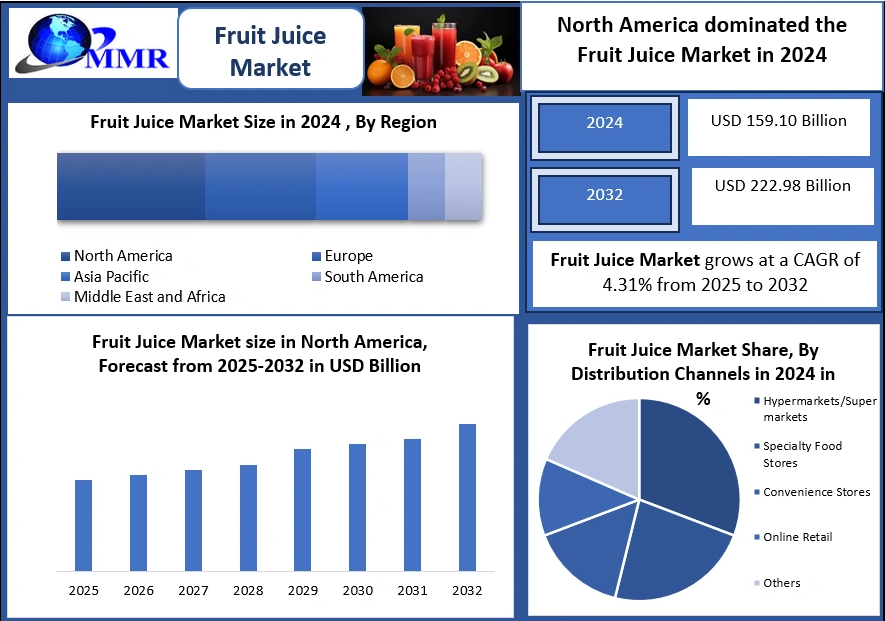Based on latest industry projections, the Global Fruit Juice Market is estimated to be around USD 159 billion in 2024 and is expected to reach approximately USD 223 billion by 2032, expanding at a CAGR of around 4–5% during the forecast period. Favorable demand trends, lifestyle changes, and evolving taste preferences are influencing market expansion across regions.