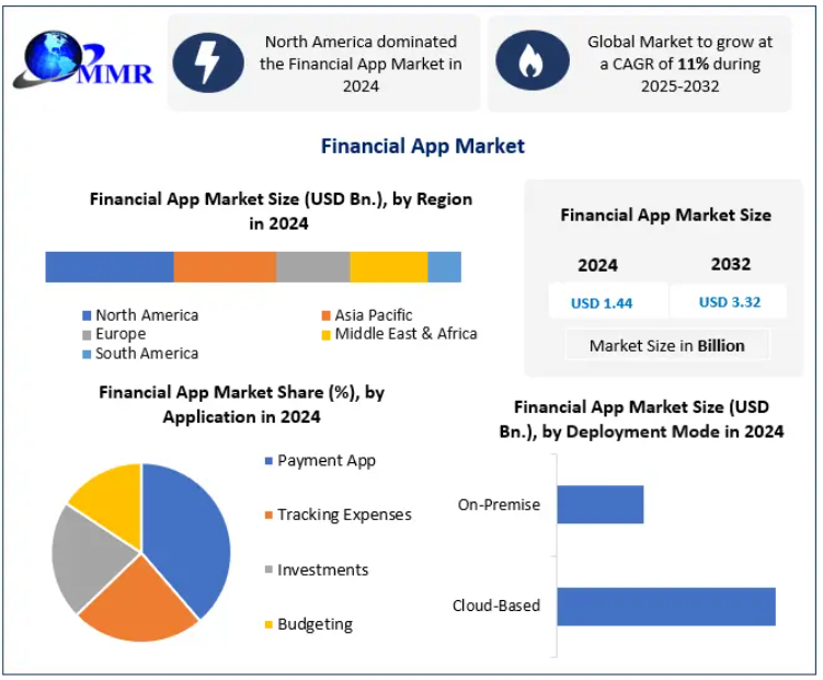The global Financial App Market was valued at USD 1.44 billion in 2024 and is projected to expand at a CAGR of 11% from 2025 to 2032, reaching approximately USD 3.32 billion by 2032. The market’s growth is strongly supported by rising demand for digital banking solutions, widespread smartphone adoption, and the growing integration of business intelligence (BI) and analytics into financial decision-making platforms.