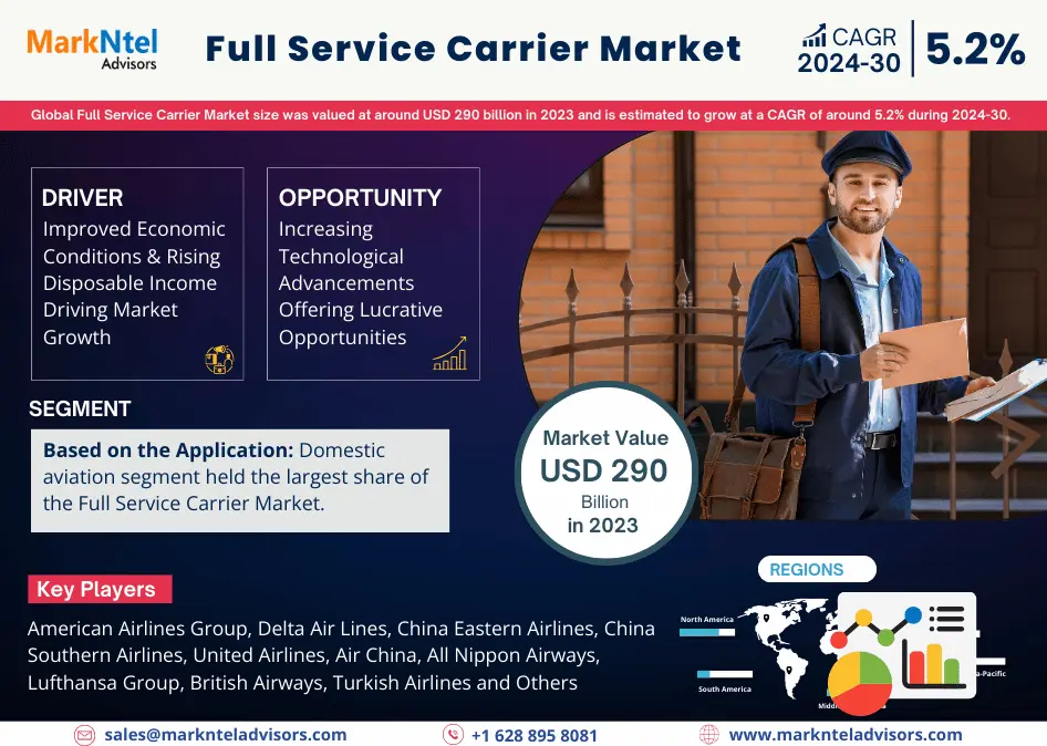 MarkNtel Advisors, a leading market research and consulting firm, has announced the release of its latest study titled Full Service Carrier Market Research Report: Forecast (2024–2030). This report provides a detailed assessment of the Full Service Carrier Market, covering its evolving dynamics, emerging trends, key growth drivers, major challenges, and competitive landscape.