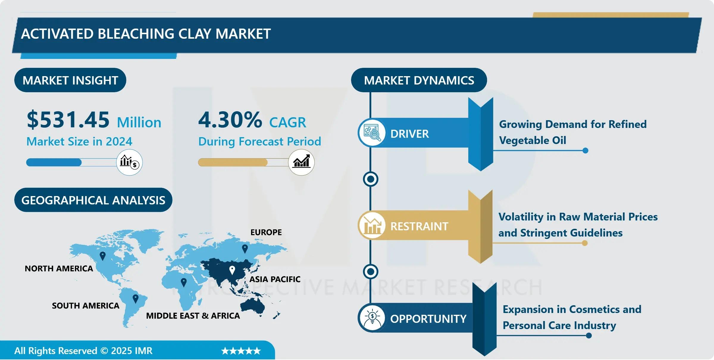 “According to a new report published by Introspective Market Research, Activated Bleaching Clay Market by Type, Application, and End-Use Industry, The Global Activated Bleaching Clay Market Size Was Valued at USD 531.45 Million in 2024 and is Projected to Reach USD 844.48 Million by 2035, Growing at a CAGR of 4.30% from 2025–2035.”