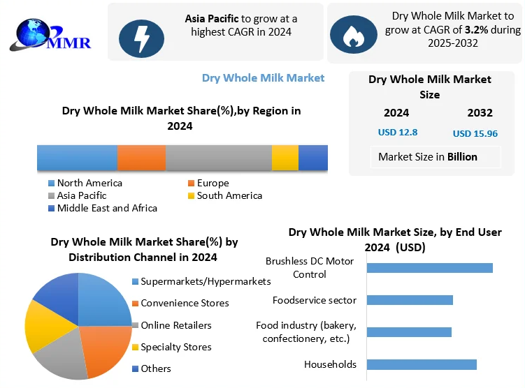 The global Dry Whole Milk Market was valued at USD 12.8 billion in 2024 and is projected to reach USD 15.96 billion by 2032, growing at a moderate CAGR of 3.2% (2025–2032). This steady growth reflects the market’s mature yet resilient nature, driven by demand for shelf-stable dairy, food processing expansion, and rising nutrition awareness in emerging economies.