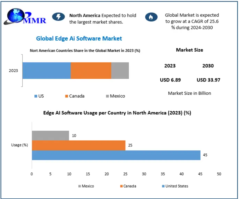 The Global Edge AI Software Market is experiencing rapid growth as artificial intelligence extends beyond centralized cloud systems to the edge of networks. Valued at USD 6.89 billion in 2023, the market is projected to reach USD 33.97 billion by 2030, growing at a remarkable CAGR of 25.6%. Edge AI software enables AI computations to be processed locally on devices such as autonomous vehicles, industrial machines, medical devices, smart cameras, and IoT-enabled systems, reducing latency and enhancing real-time decision-making.