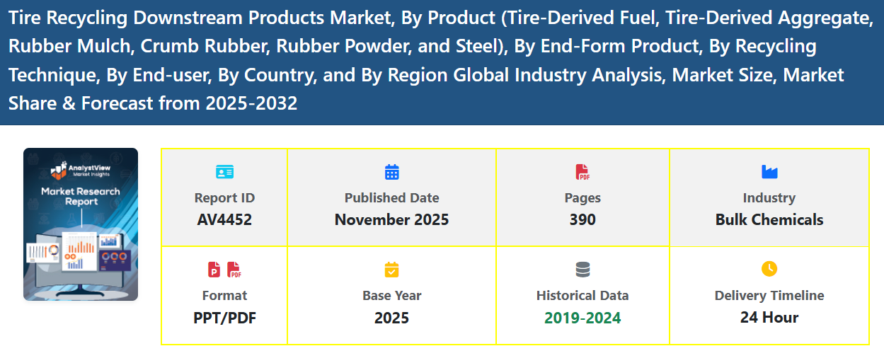 The Tire Recycling Downstream Products Market is expanding rapidly as global sustainability goals, circular-economy initiatives, and waste-management regulations push industries toward more efficient use of end-of-life tires. Each year, millions of tons of scrap tires are discarded worldwide, creating environmental challenges and disposal burdens for municipalities and industries. Tire recycling downstream products—such as crumb rubber, rubber powder, reclaimed rubber, tire-derived fuel (TDF), molded rubber goods, and rubberized asphalt—play a crucial role in turning this waste into commercially valuable materials.