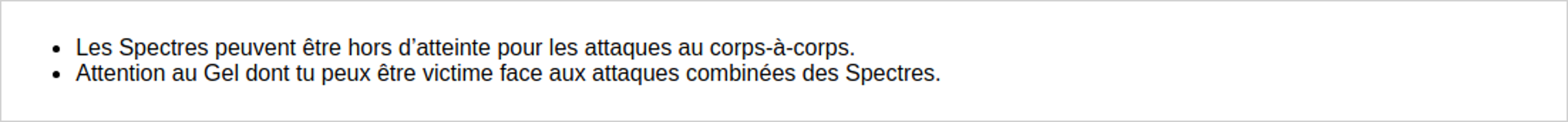 Concernant leurs résistances, les spectres cryo sont immunisés contre la glace, tout comme ceux hydro contre l’eau. En revanche, ils sont vulnérables à tous les autres éléments, ce qui doit guider le choix des personnages et des attaques lors du combat.