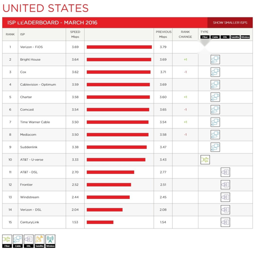 • CenturyLink, which has experienced a steady decline since November, now ranks at the bottom of the U.S. list with an average speed of 1.53 Mbps. Interestingly, Costa Rica's average speed in March was slightly higher at 1.87 Mbps, making it the slowest among tracked countries.