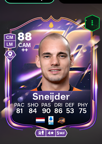 Introducing Wesley Sneijder's Heroes card, an 88-rated Central Attacking Midfielder who excels with a remarkable passing rating of 90, complemented by strong dribbling (86), shooting (84), and pace (81), alongside solid physicality (75). As a CAM, Sneijder's primary advantage lies in his exceptional playmaking ability; his pinpoint passing and creative vision allow him to dictate the tempo in the final third, expertly threading through balls to unlock stubborn defenses and create decisive scoring opportunities for his teammates.