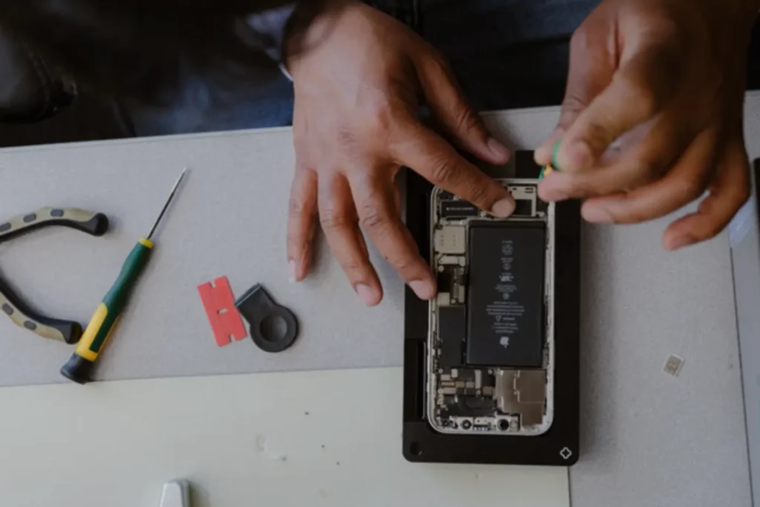 - Device Preparation iPhone powered off, battery safely discharged below 25% to reduce risk.