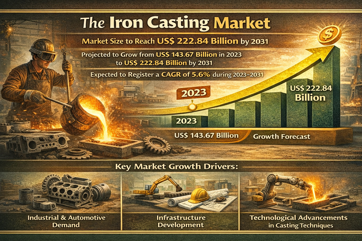The iron casting market size is projected to expand from US$ 143.67 billion in 2023 to US$ 222.84 billion by 2031, registering a CAGR of 5.6 percent during the forecast period. Market growth is driven by rising vehicle production, infrastructure development, and technological advancements in casting processes that improve quality and reduce production costs.