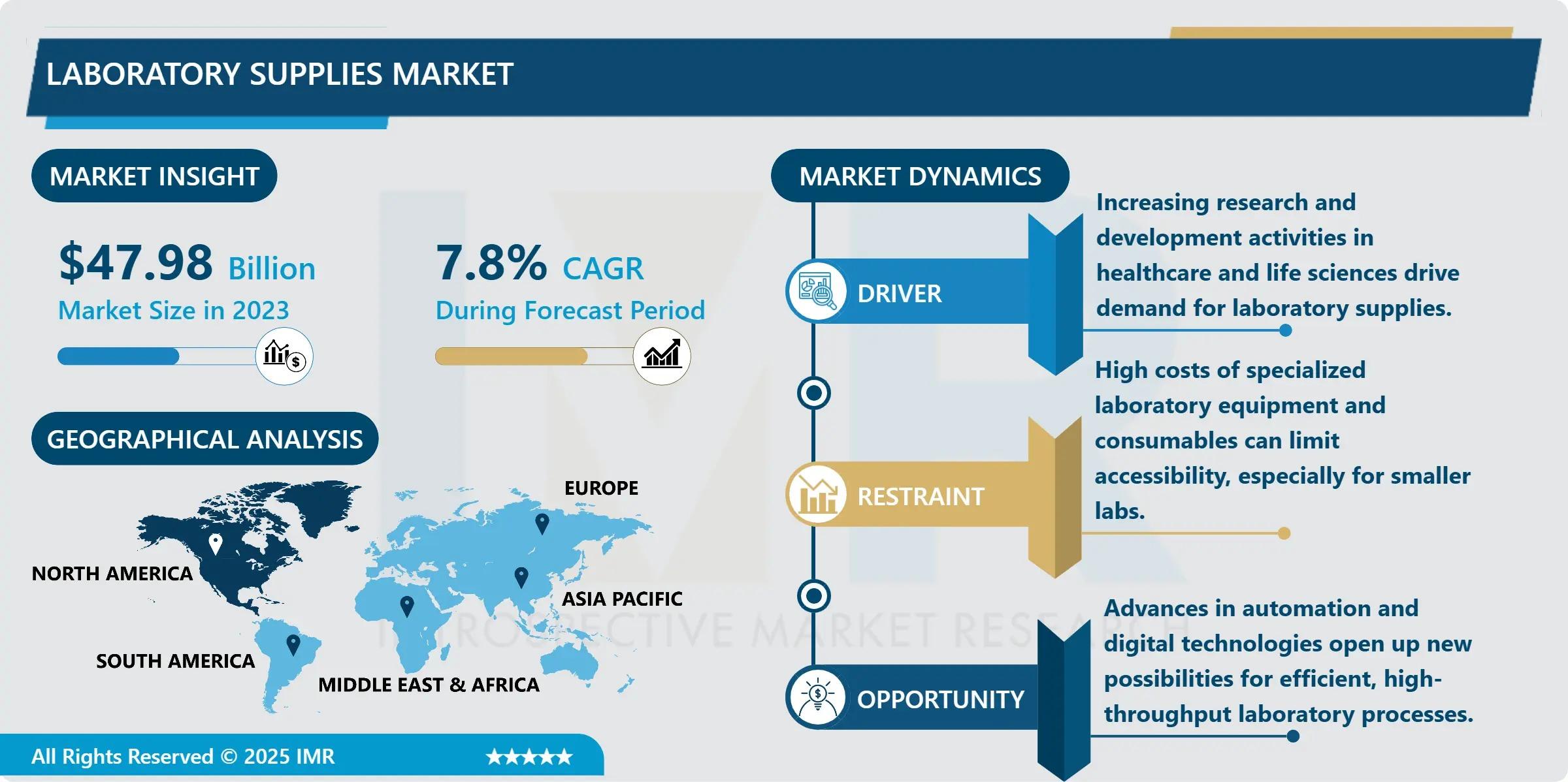 A major market opportunity lies in the growing adoption of automated and high-throughput laboratory systems, which require consistent and standardized laboratory supplies. The increasing focus on precision medicine, genomics, and proteomics is creating strong demand for specialized reagents and consumables. Additionally, the expansion of diagnostic laboratories in developing regions, along with the rise of contract research organizations (CROs), presents lucrative growth opportunities for market players. Innovations in eco-friendly and sustainable laboratory supplies are also expected to unlock new revenue streams in the coming years.