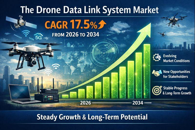 The Drone Data Link System market is undergoing rapid transformation as technological advancements continue to expand the capabilities of unmanned aerial vehicles. The Drone Data Link System Market is anticipated to expand at a CAGR of 17.5% from 2026 to 2034.Reliable data link systems are critical for maintaining communication between drones and ground control stations, supporting real time transmission of command, telemetry, and sensor data. Innovations in this field are enabling longer range, enhanced security, and autonomous operation, making drones more effective for both commercial and military applications.