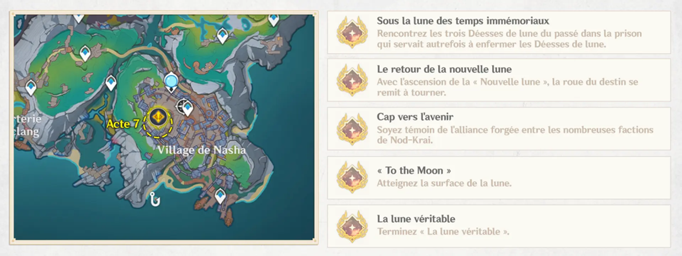 À la conclusion de l’acte 7, la quête des archons intitulée « La Lune Véritable » (Chant de l’Astre de la Nuit – Acte 8) se déclenche automatiquement.