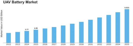 The battery segment of UAVs is forecast to grow robustly, with UAV Battery Market valuations rising from around USD 1.61 billion in 2023 to about USD 5.0 billion by 2035 — a CAGR of roughly 9.9%. This growth is a reflection not just of increasing UAV quantity but of advancing mission complexity — from simple aerial imaging to beyond-visual-line-sight (BVLOS) delivery, heavy-lift cargo drones, and defence reconnaissance missions.