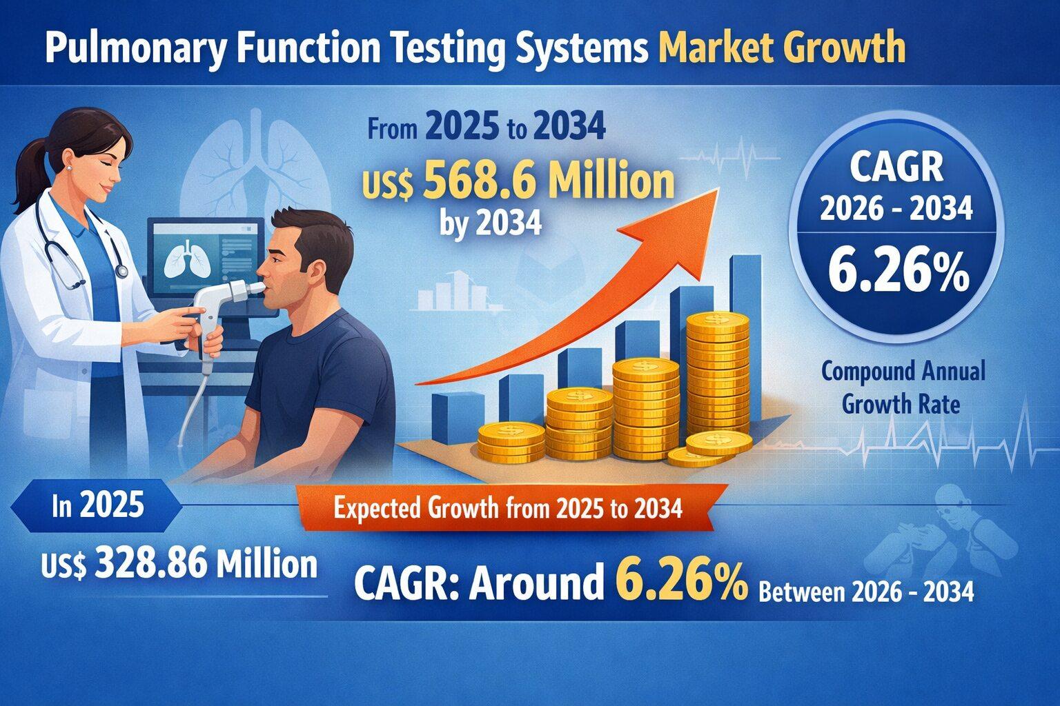 The Pulmonary Function Testing Systems Market is projected to increase from US$ 328.86 million in 2025 to US$ 568.6 million by 2034, registering a CAGR of 6.26% during 2026 to 2034. This steady expansion reflects the rising global burden of chronic respiratory diseases and the growing importance of early and accurate diagnosis. Increasing awareness about lung health, expansion of respiratory care infrastructure, and integration of advanced digital technologies are supporting long term growth across developed and emerging economies.