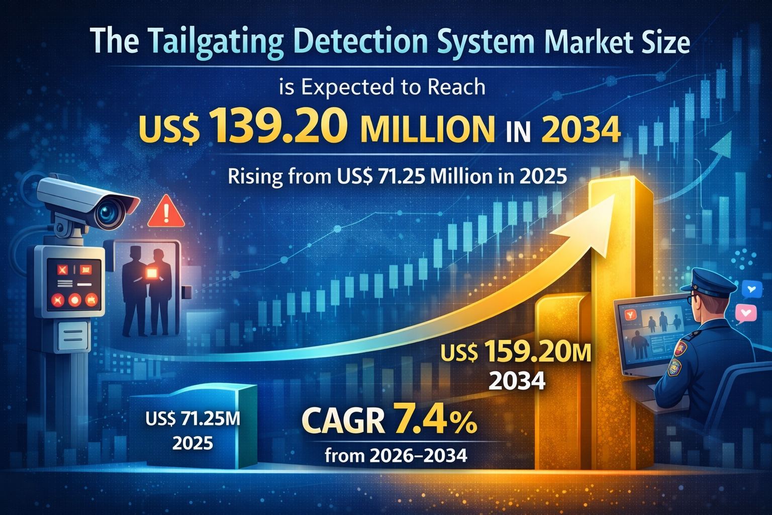 The Tailgating detection system market is projected to grow steadily, reaching US$ 139.20 million by 2034 from US$ 71.25 million in 2025, registering a CAGR of 7.4% during the forecast period from 2026 to 2034. This growth reflects the increasing importance of advanced physical security solutions across commercial, government, and critical infrastructure sectors. Tailgating detection systems are designed to identify unauthorized individuals attempting to access restricted areas by closely following authorized personnel. These systems use advanced technologies such as video analytics, artificial intelligence, infrared sensors, and biometric integration to detect unauthorized entry attempts and trigger alerts. As organizations prioritize safety, compliance, and access control, the demand for tailgating detection systems continues to rise globally.