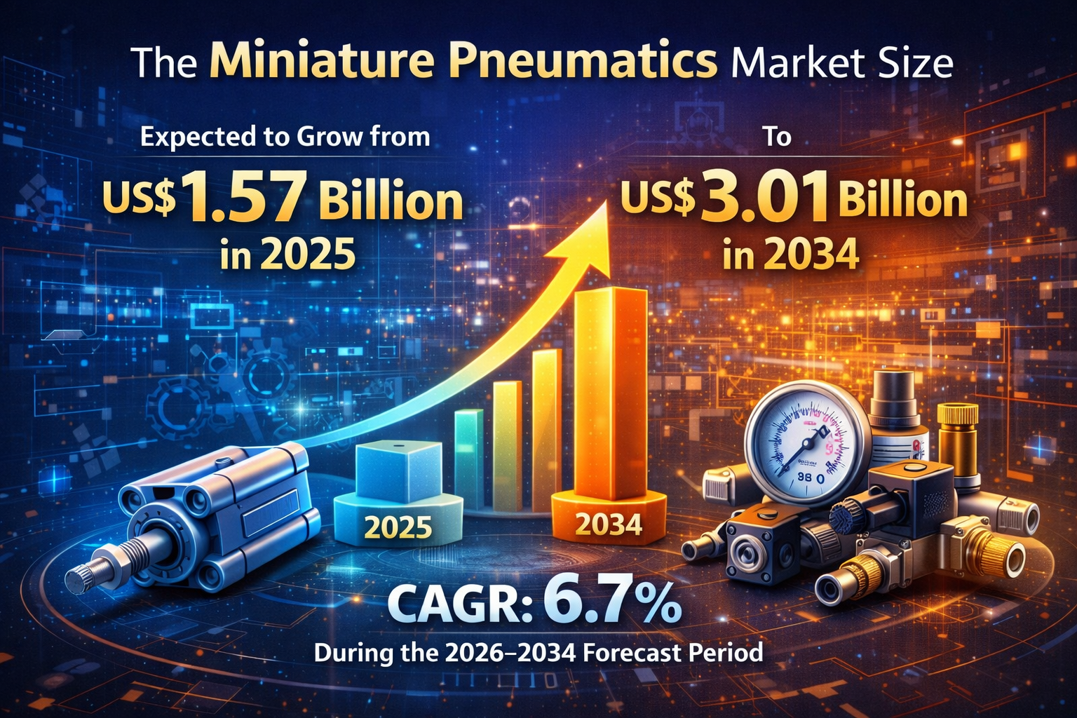 The miniature pneumatics market was valued at US$ 1.57 billion in 2025 and is projected to reach approximately US$ 3.01 billion by 2034, registering a CAGR of 6.7% during the forecast period 2026 to 2034. Miniature pneumatics, also known as precision pneumatics, include compact components such as valves, cylinders, manifolds, tubing, and specialized devices designed for applications where space, weight, and energy efficiency are critical. These systems provide reliable motion and fluid control while maintaining high precision and performance in compact environments.