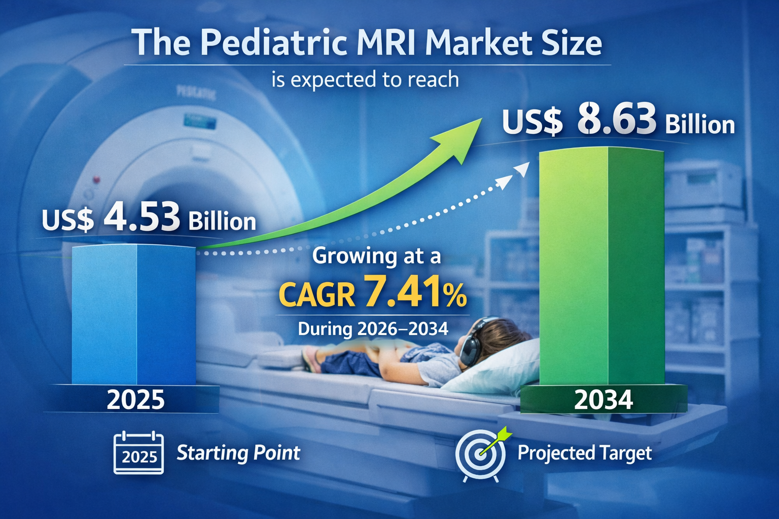 The Pediatric MRI Market is poised for substantial growth over the forecast period 2026–2034, driven by rising pediatric disease prevalence, technological advancements in magnetic resonance imaging systems, and growing demand for radiation-free diagnostic solutions. The market is projected to grow from US$ 4.53 billion in 2025 to US$ 8.63 billion by 2034, registering a CAGR of 7.41% during the forecast period.