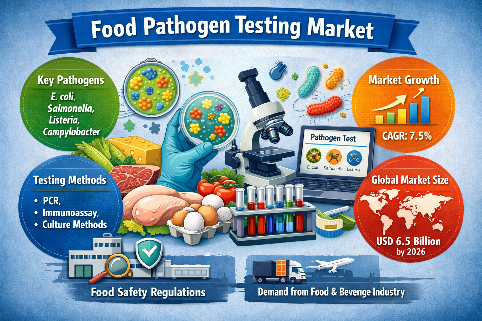 The food pathogen testing industry plays a critical role in safeguarding public health and ensuring regulatory compliance across the global food supply chain, focusing on the detection of harmful microorganisms such as Salmonella, Listeria, and E. coli in raw materials and finished products. Growth is driven by stringent food safety regulations, rising incidences of foodborne illnesses, globalization of food trade, and increasing consumer awareness regarding product transparency and traceability. Major players including Eurofins Scientific, SGS, Bureau Veritas, and Intertek provide laboratory testing, rapid diagnostics, and on-site inspection services using advanced technologies such as PCR, immunoassays, and next-generation sequencing. The industry is increasingly shaped by demand for faster turnaround times, automation, digital data management systems, and preventive risk-based food safety approaches aligned with international standards such as HACCP and FSMA.