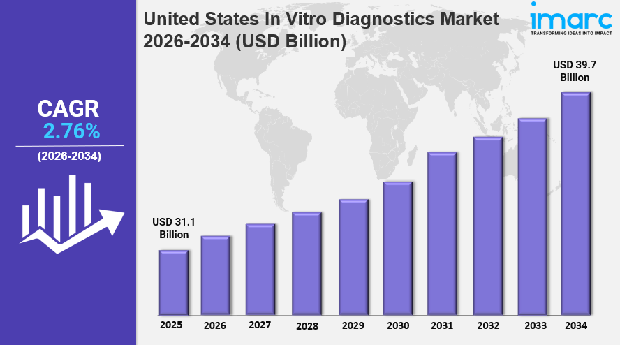 The United States In Vitro Diagnostics Market was valued at USD 31.1 Billion in 2025 and is projected to reach USD 39.7 Billion by 2034, growing at a CAGR of 2.76% during 2026-2034. This growth is fueled by the rising prevalence of chronic diseases, technological advancements in diagnostic tools like molecular diagnostics, and increasing demand for personalized medicine. Supportive government initiatives and integration of AI and machine learning in diagnostics further augment market expansion.