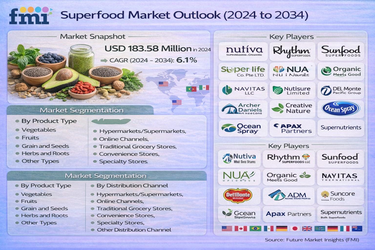 The global superfood industry is entering a decisive growth decade. According to a newly revised edition of the Superfood Market Outlook 2024 to 2034 by Future Market Insights (FMI), the market is projected to reach USD 183.58 billion in 2024 and expand at a 6.1% CAGR through 2034, ultimately attaining USD 330.67 billion in value.