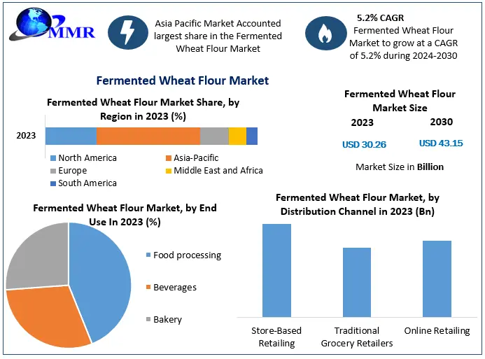 The Global Fermented Wheat Flour Market was valued at USD 30.26 billion in 2023 and is projected to grow to USD 43.15 billion by 2030, registering a CAGR of 5.2% during the forecast period. The market’s growth is largely fueled by increasing consumer awareness regarding gluten sensitivity, rising health-consciousness, and the growing preference for natural and clean label products.