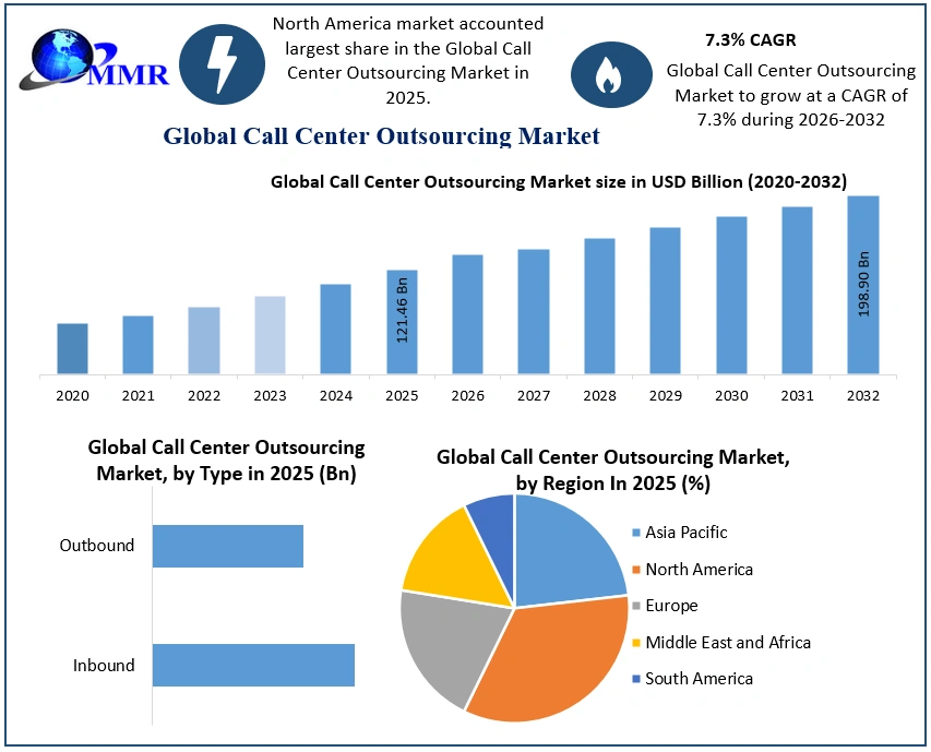 The Global Call Center Outsourcing Market was valued at USD 121.46 billion in 2025 and is projected to reach nearly USD 198.90 billion by 2032, expanding at a CAGR of 7.3% during the forecast period. According to industry analysis, enterprises across BFSI, telecommunications, healthcare, retail, and e-commerce sectors are increasingly outsourcing customer engagement functions to improve operational efficiency, enhance service scalability, and reduce fixed infrastructure costs.