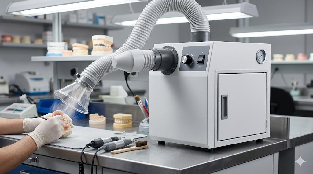 A dental laboratory dust suction unit is a device designed to extract airborne dust and particles generated during dental restoration and prosthetic manufacturing processes.