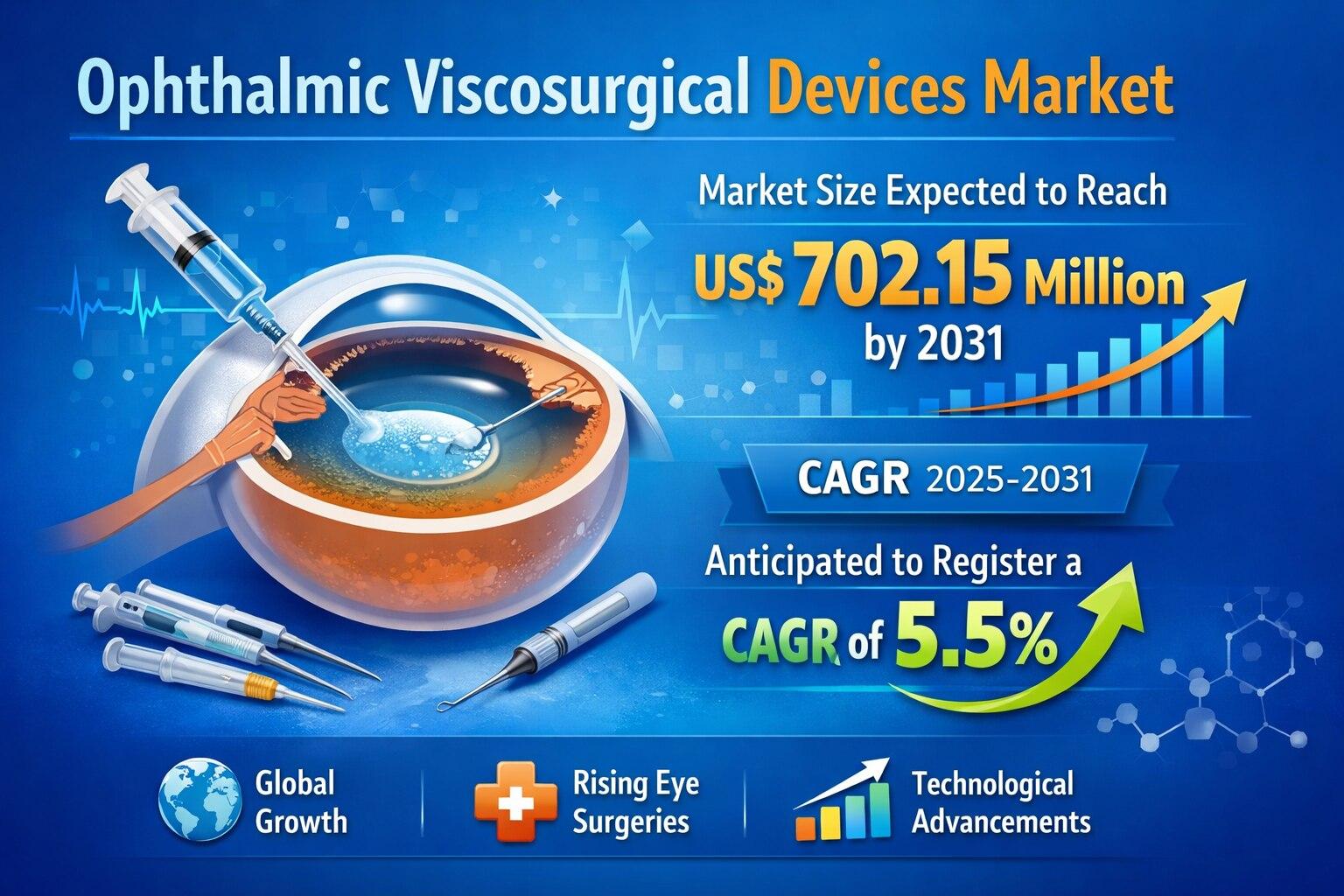 The Ophthalmic Viscosurgical Devices Market is projected to reach US$ 702.15 Million by 2031, registering a CAGR of 5.5% during the forecast period from 2025 to 2031. These devices play a vital role in modern ophthalmic surgeries by maintaining anterior chamber stability, protecting corneal endothelium, and facilitating intraocular lens implantation. Growing procedural volumes, particularly in cataract and refractive surgeries, are strengthening overall industry performance across developed and emerging economies.