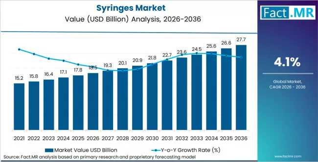 The global syringes market is entering a decade of sustained structural growth, projected to rise from USD 18.53 billion in 2026 to USD 27.69 billion by 2036. According to a definitive strategic analysis by FACT.MR, the industry is advancing at a 4.1% CAGR, driven by a global tightening of safety regulations, the rapid rise of self-administered biologics, and massive healthcare infrastructure investments in emerging economies.