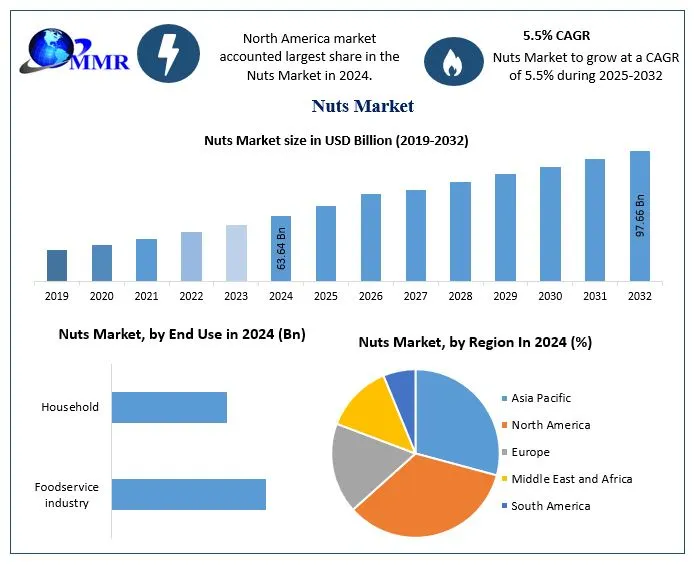 The global nuts market was valued at USD 63.64 billion in 2024 and is projected to grow at a compound annual growth rate (CAGR) of 5.5% from 2025 to 2032, reaching nearly USD 97.66 billion by the end of the forecast period. This growth trajectory reflects increasing global consumption, rising disposable incomes, and expanding applications of nuts across food and beverage industries.