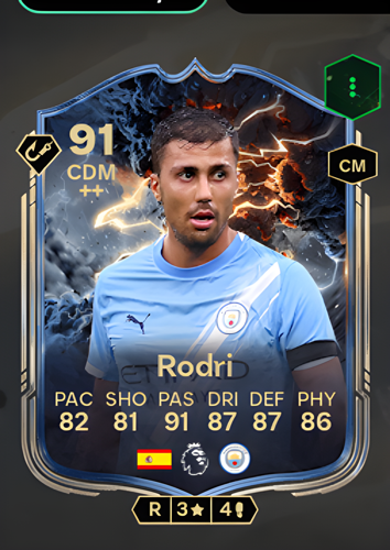Introducing Rodrigo Hernández Cascante's Thunderstruck card, a formidable Central Defensive Midfielder boasting an impressive overall rating of 91. This elite card showcases his exceptional attributes, including a remarkable 91 passing, 87 dribbling, 87 defense, and a well-rounded physicality of 86, complemented by a solid 82 pace and 81 shooting. As a CDM, this card excels in controlling the midfield with its outstanding defensive awareness and ability to break up opposition plays, while its superior passing range and composure on the ball allow for initiating swift, precise counter-attacks. This makes Rodri an invaluable asset in transitioning from defense to offense, helping to dominate possession, disrupt the opponent's rhythm, and create pivotal opportunities to secure victory in any match.