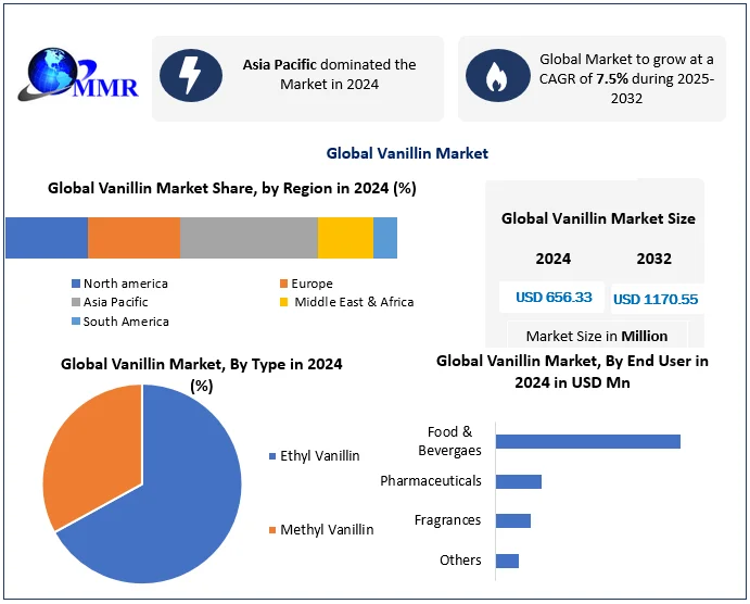 The Global Vanillin Market, valued at USD 656.33 million in 2024, is poised for significant growth, projected to reach nearly USD 1,170.55 million by 2032, expanding at a robust CAGR of 7.5% during the forecast period from 2025 to 2032. Vanillin, a naturally occurring aromatic compound primarily derived from vanilla beans or synthesized via chemical and fermentation processes, has become a critical ingredient in the food & beverage, pharmaceutical, cosmetic, and personal care industries. Rising consumer demand for clean-label products, natural ingredients, and multifunctional compounds is driving this market expansion.